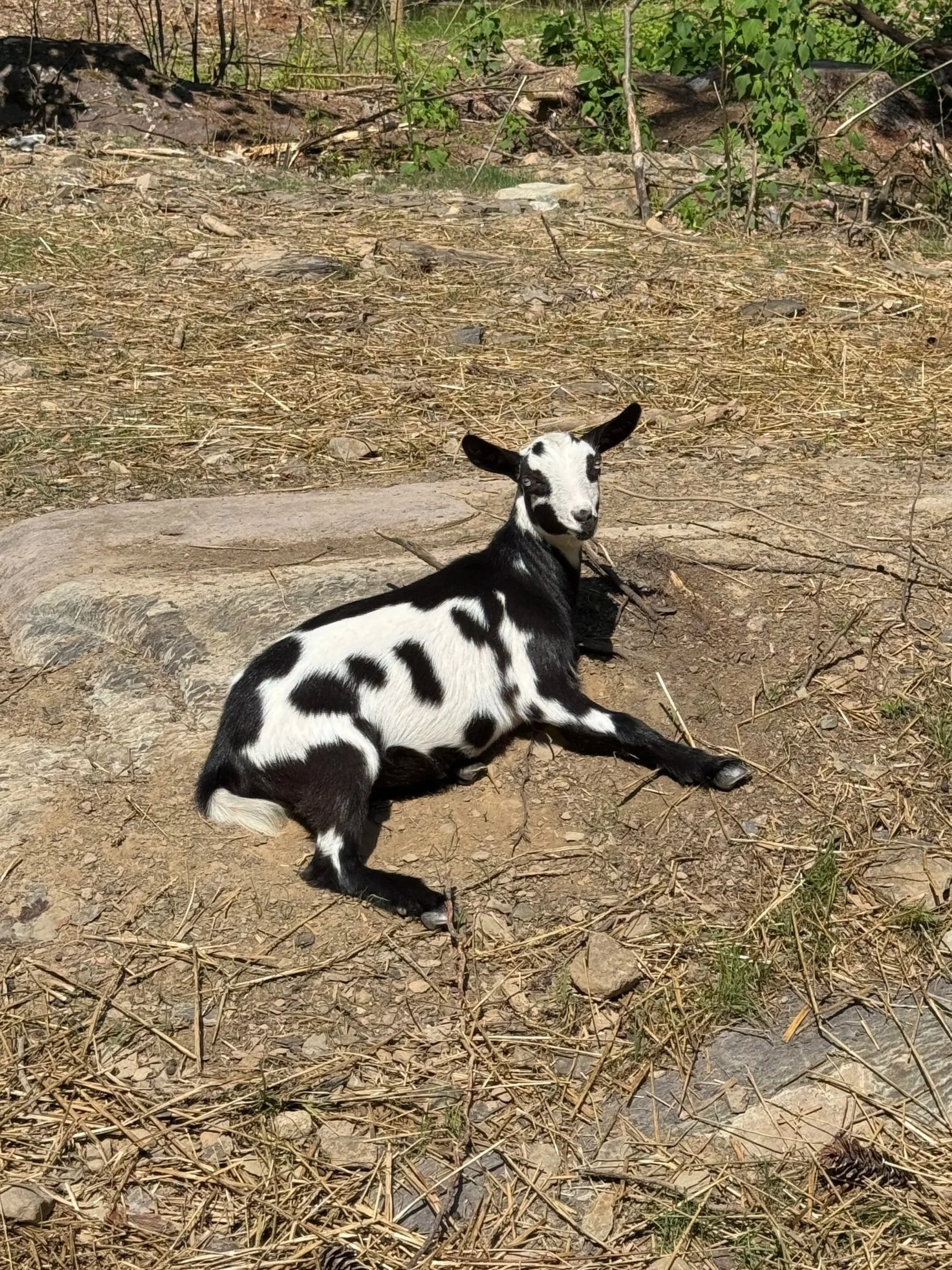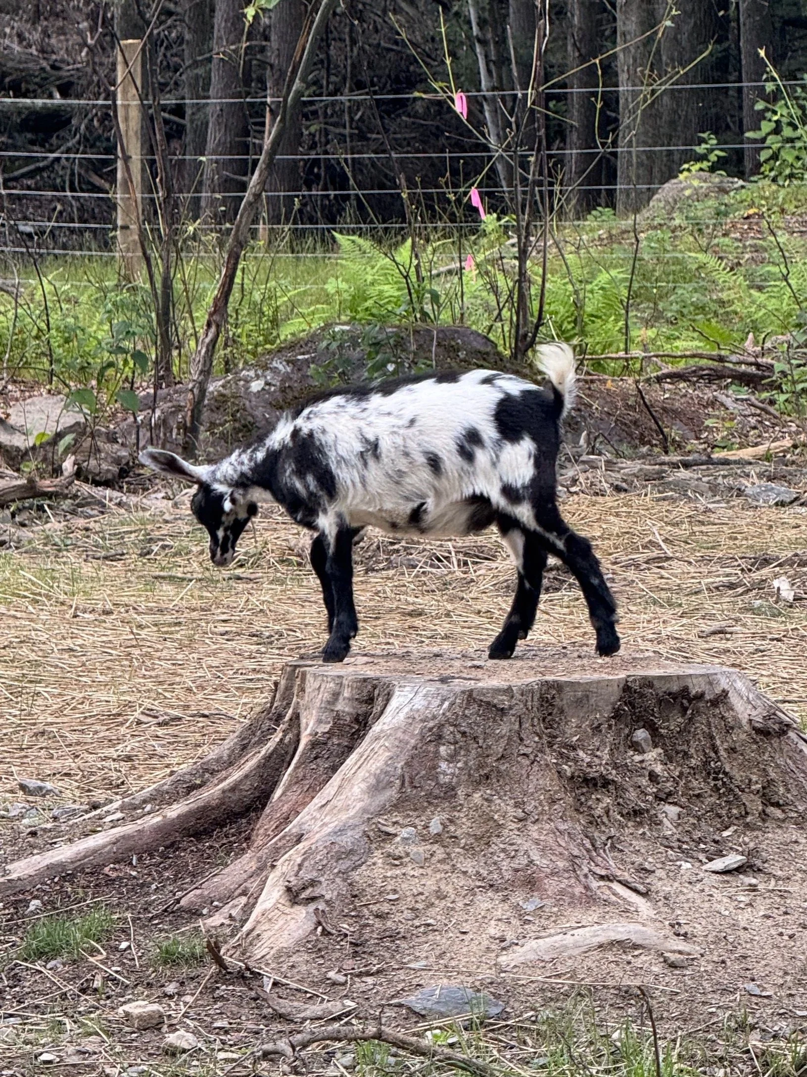 Daisy is a striking white and black buckskin doe with blue eyes, backed by strong Capra Salato and AGS Doubletree genetics. She combines visual presence with sound structure and predictability, making her a well-rounded and intentional addition to our breeding program. Daisy brings both visual appeal and reliability, and she is a strong milker.