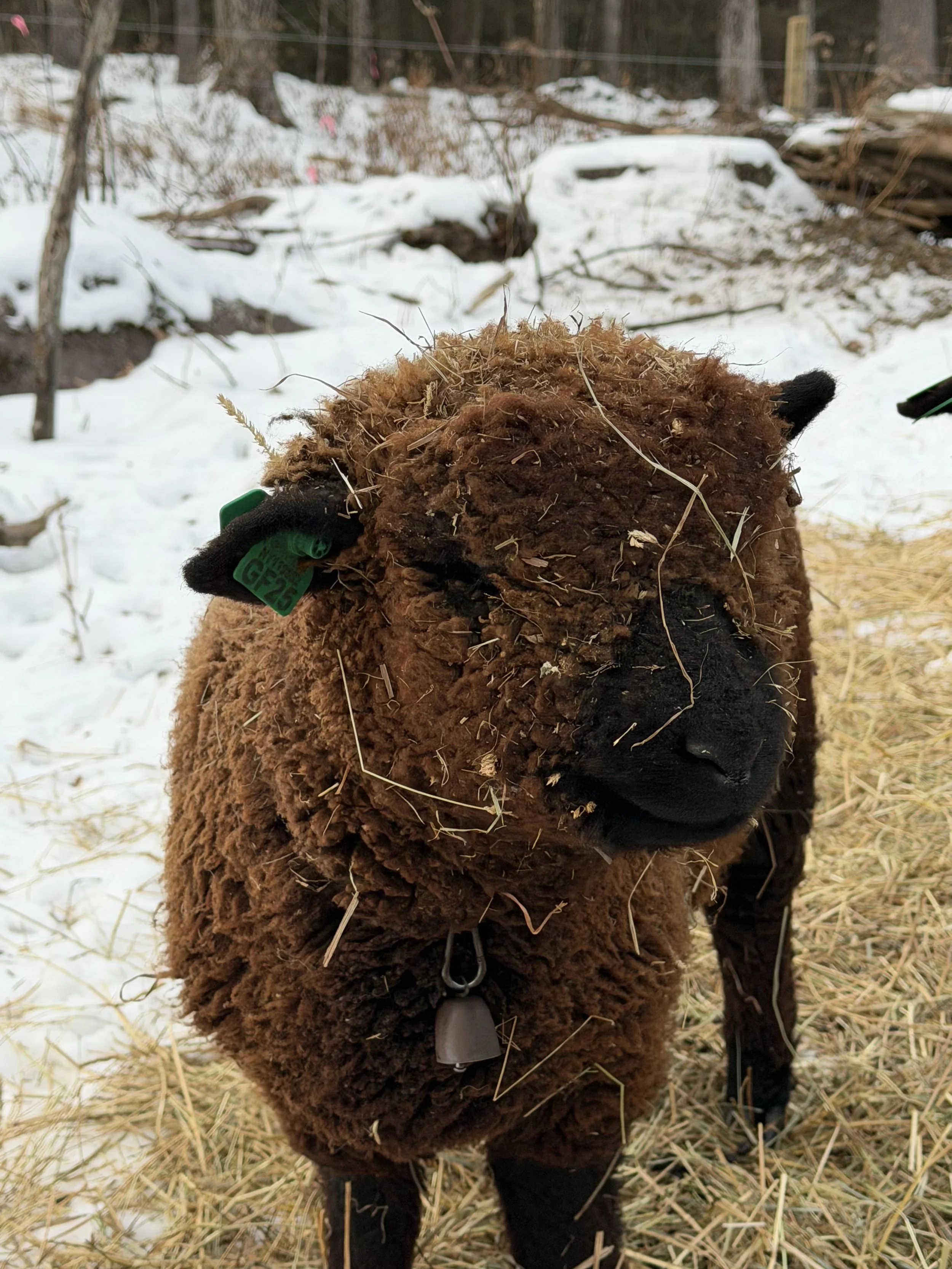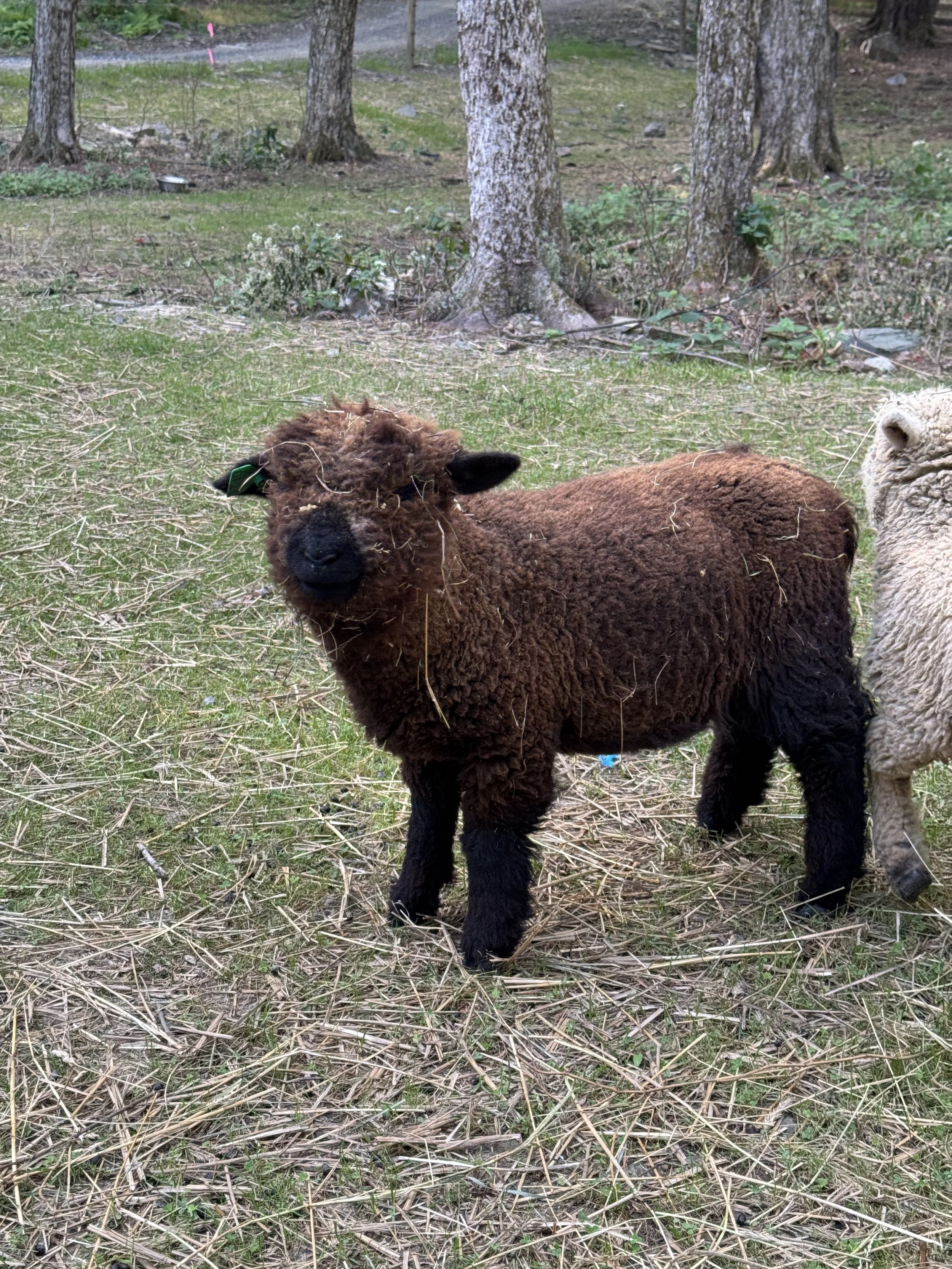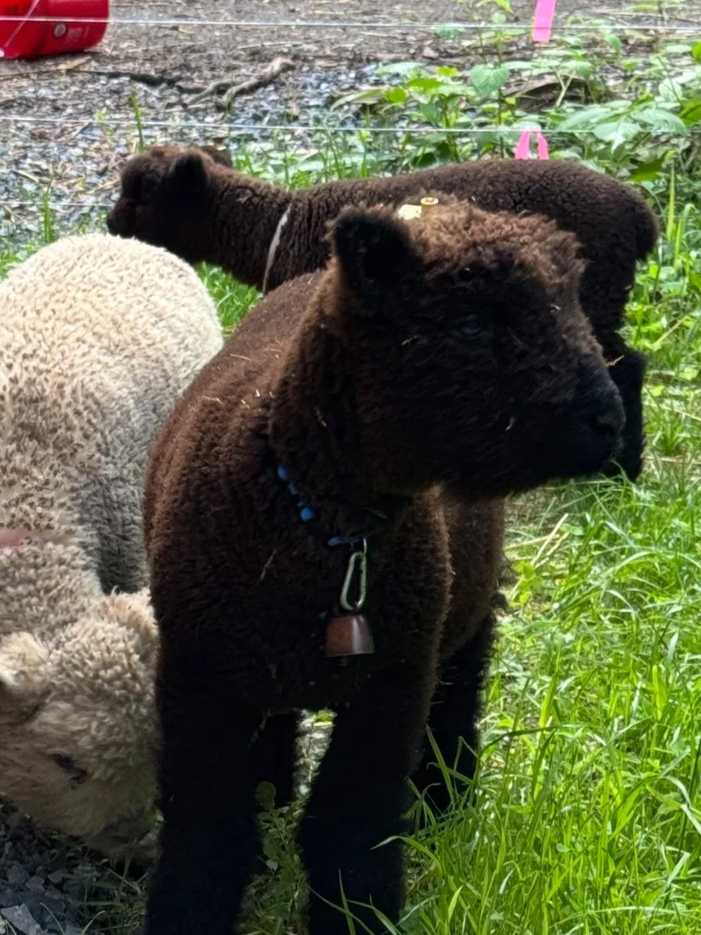 Hollly is a black Babydoll ewe with a compact, moderate frame and a calm, steady temperament. Her dense, curly fleece currently gives her a fuller appearance, while her underlying structure shows good body and substance.